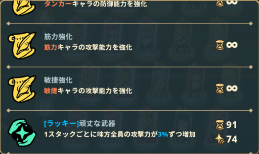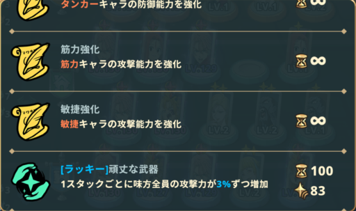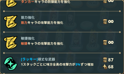 -25% | タンカー強化Ⅰ | タンカーキャラの攻撃能力を強化 |