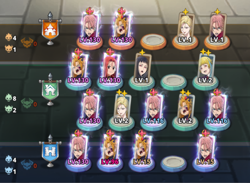 守護の誓い「血祭り」「もう一つの騎士団」により特定のカテゴリのキャラ4体以上を編成することで、誓いポイントを獲得できる為、以下のカテゴリから4体入れ、残りの枠は「ボーナスキャラ」などスタート銀貨を多くもらえるキャラを編成しましょう。